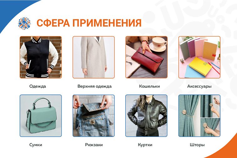 Применяются в одежде, обуви, сумках, папках, ежедневниках, органайзерах, клатчах, кошельках, футлярах и прочей галантерее, и аксессуарах.