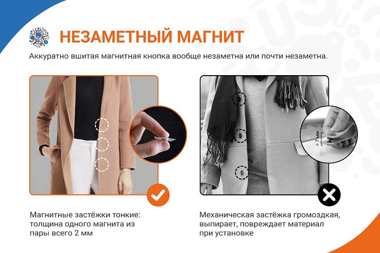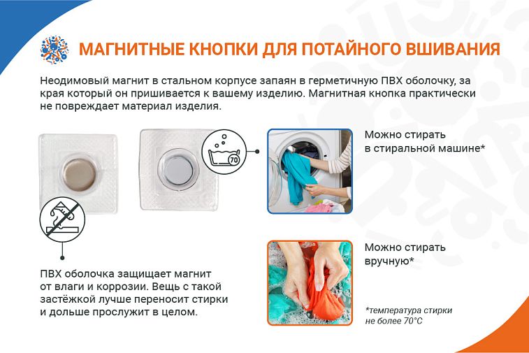 Магнитные кнопки (застёжки) для кожи и текстиля можно пришивать поверх материала изделия или вшивать под материал.