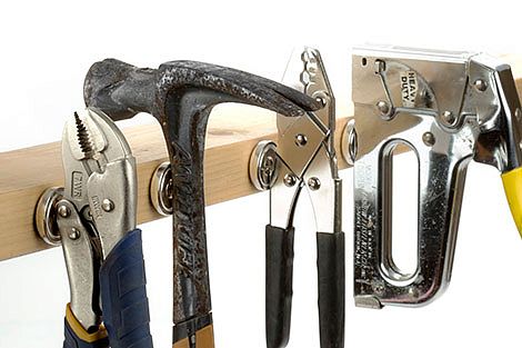 Если приложить к магнитам  пленку для визуализации магнитных полей, вы увидите необычный рисунок. Покажите детям – очень захватывающее зрелище. С помощью неодимового магнита диска с зенковкой можно организовать хранение инструментов дома, на даче или в гараже.